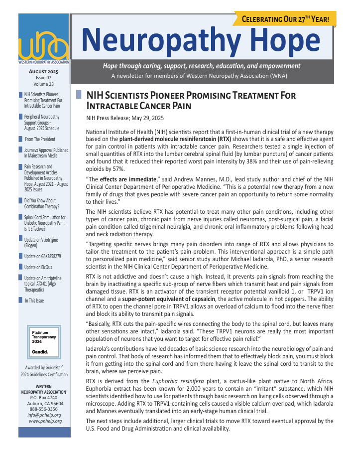 UC Davis Researcher Will Test Non-Addictive Drug That Could Lead To A New Way To Treat Pain, WNA Support Groups, President’s Message, Bios Of Group Leaders Receiving Awards, Neuropathy Medical Literature Review