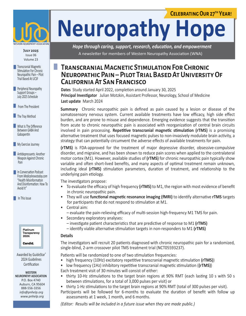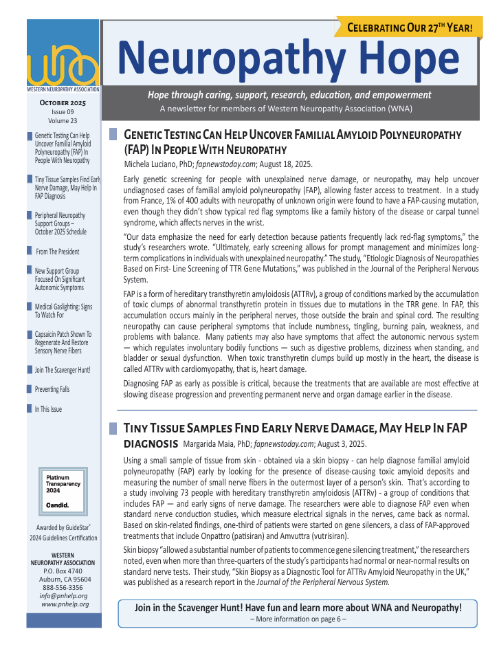 Our monthly newsletter includes information and research on treatments, updates on clinical trials, background on nerve disease and definitions, and member experiences with exercise, supplements, etc. Become a member of the Western Neuropathy Association here to receive the latest issue straight to your inbox.